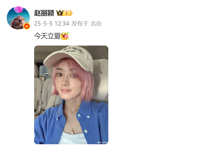 5月5日,赵丽颖发微博:“今天立夏”,并配以粉色发色造型的照片。这一罕见的粉色系发色造型,为夏日增添了一抹清新与活力。