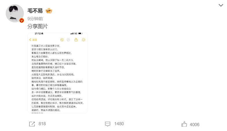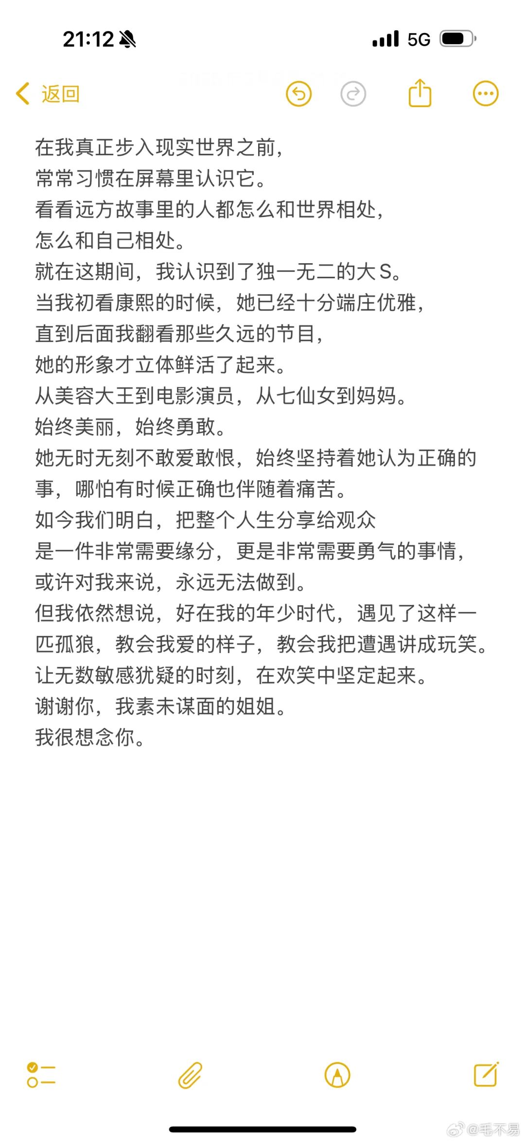 5月9日,毛不易发文谈大S:“她无时无刻不敢爱敢恨,始终坚持着她认为正确的事,哪怕有时候正确也伴随着痛苦……好在我的年少时代,遇见了这样一匹孤狼,教会我爱的样子,教会我把遭遇讲成玩笑让无数敏感犹疑的时刻,在欢笑中坚定起来。谢谢你,我素未谋面的姐姐。我很想念你。”