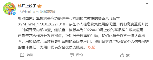针对国家计算机病毒应急处理中心检测报告披露的爱奇艺(版本X9M_m1e_17.0.0.20221018)存在个人信息收集使用的问题,我们高度重视并第一时间开展内部核查。经核查,该版本为2022年10月上线的某品牌车载端应用,由爱奇艺合作方开发并提供。针对报告披露的问题,我们正与合作方一道认真核查,积极整改,后续将更新合规的新版本应用。我们会继续严格落实个人信息保护的主体责任,为用户提供安全优质的服务。