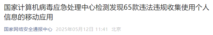 据国家网络与信息安全信息通报中心通报,依据《网络安全法》《个人信息保护法》等法律法规,按照《中央网信办、工业和信息化部、公安部、市场监管总局关于开展2025年个人信息保护系列专项行动的公告》要求,经国家计算机病毒应急处理中心检测,65款移动应用存在违法违规收集使用个人信息情况,现通报如下。
