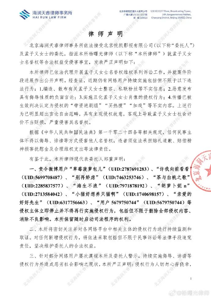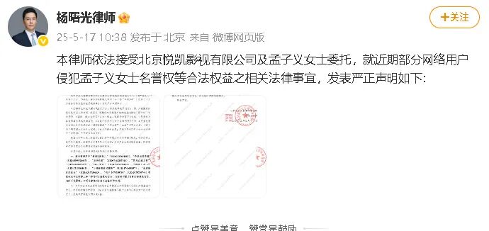 5月17日,演员孟子义方律师@杨曙光律师 就近期部分网络用户侵犯孟子义女士名誉权等合法权益之相关法律事宜,发表严正声明。