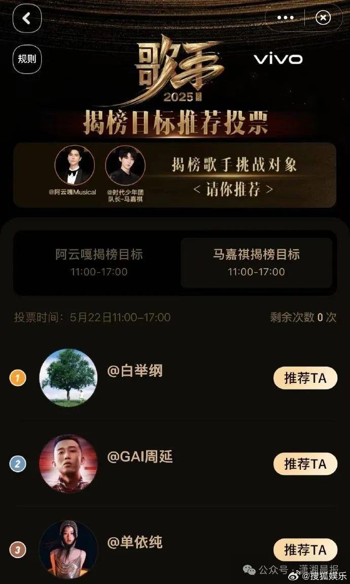 揭榜歌手阿云嘎将从陈楚生、林志炫、单依纯三位中选择一位歌手进行揭榜挑战,时代少年团队长马嘉祺 将从白举纲、GAI周延、单依纯三位中选择一位歌手进行揭榜挑战。