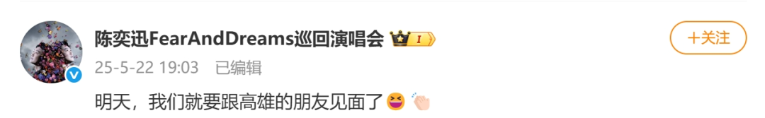 22日晚早些时候,陈奕迅巡回演唱会官方微博也发文:“明天,我们就要跟高雄的朋友见面了!”