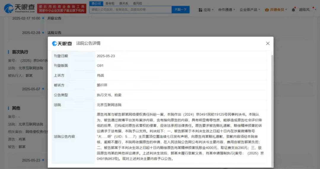 5月23日,记者从天眼查平台了解到,因郭某某未履行致歉义务,肖战申请强制执行,北京互联网法院公告肖战与其网络侵权责任纠纷一案民事判决书。