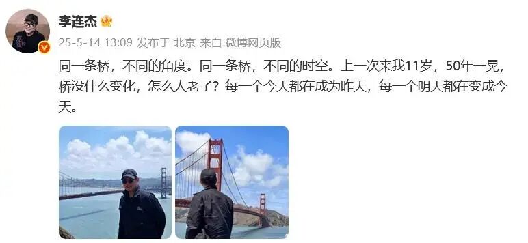 此前,李连杰晒出时隔50年重返金门大桥的照片,感慨“怎么人老了”。
