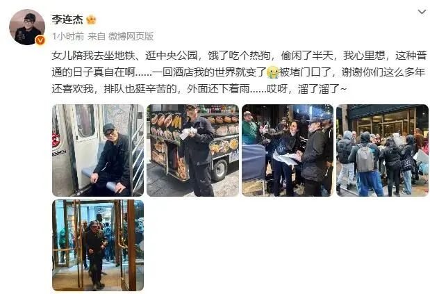 李连杰表示:“女儿陪我去坐地铁、逛中央公园,饿了吃个热狗,偷闲了半天,我心里想,这种普通的日子真自在啊。”