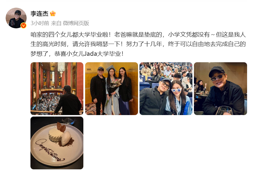 其微博还晒出与女儿的合影,称四个女儿都已大学毕业,自己是垫底的。