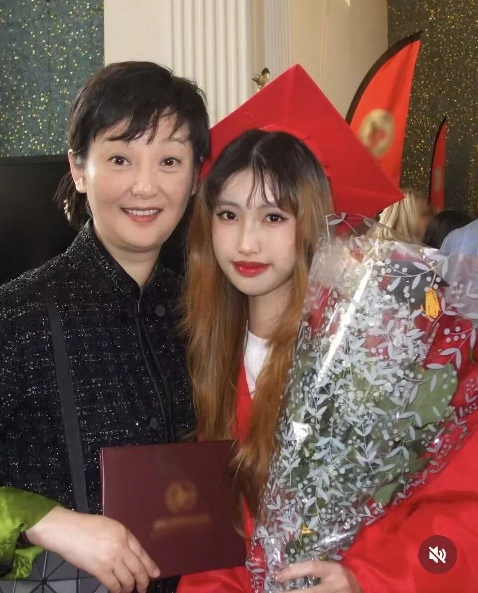 从照片中可以看出,徐朵画着浓妆,穿着红色毕业礼服,妈妈徐帆穿着黑色外套,得体大方。