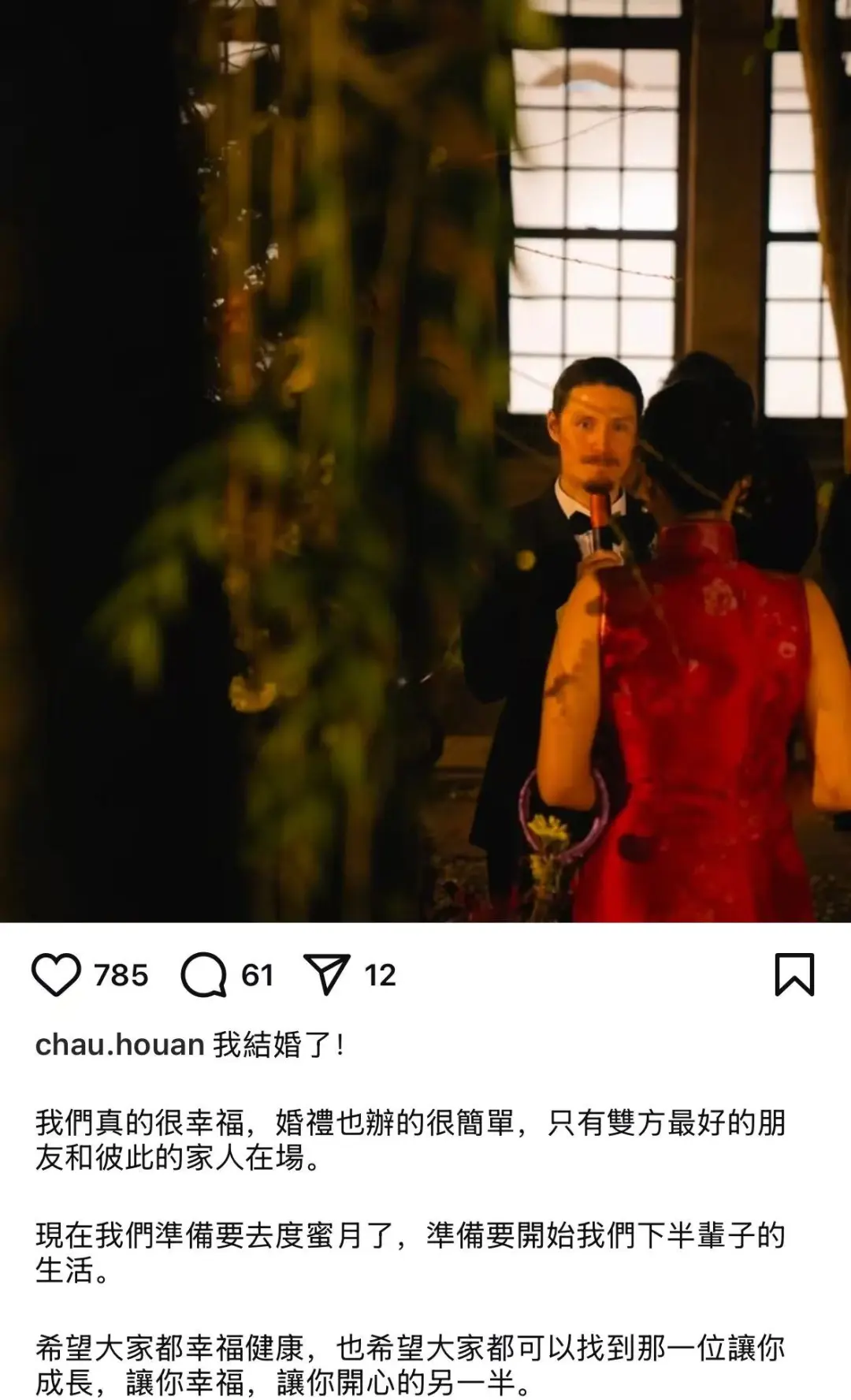 周厚安发文:“我结婚了!”并透露婚礼过程相当温馨,“我们真的很幸福,婚礼也办得很简单,只有双方最好的朋友和彼此的家人在场。”