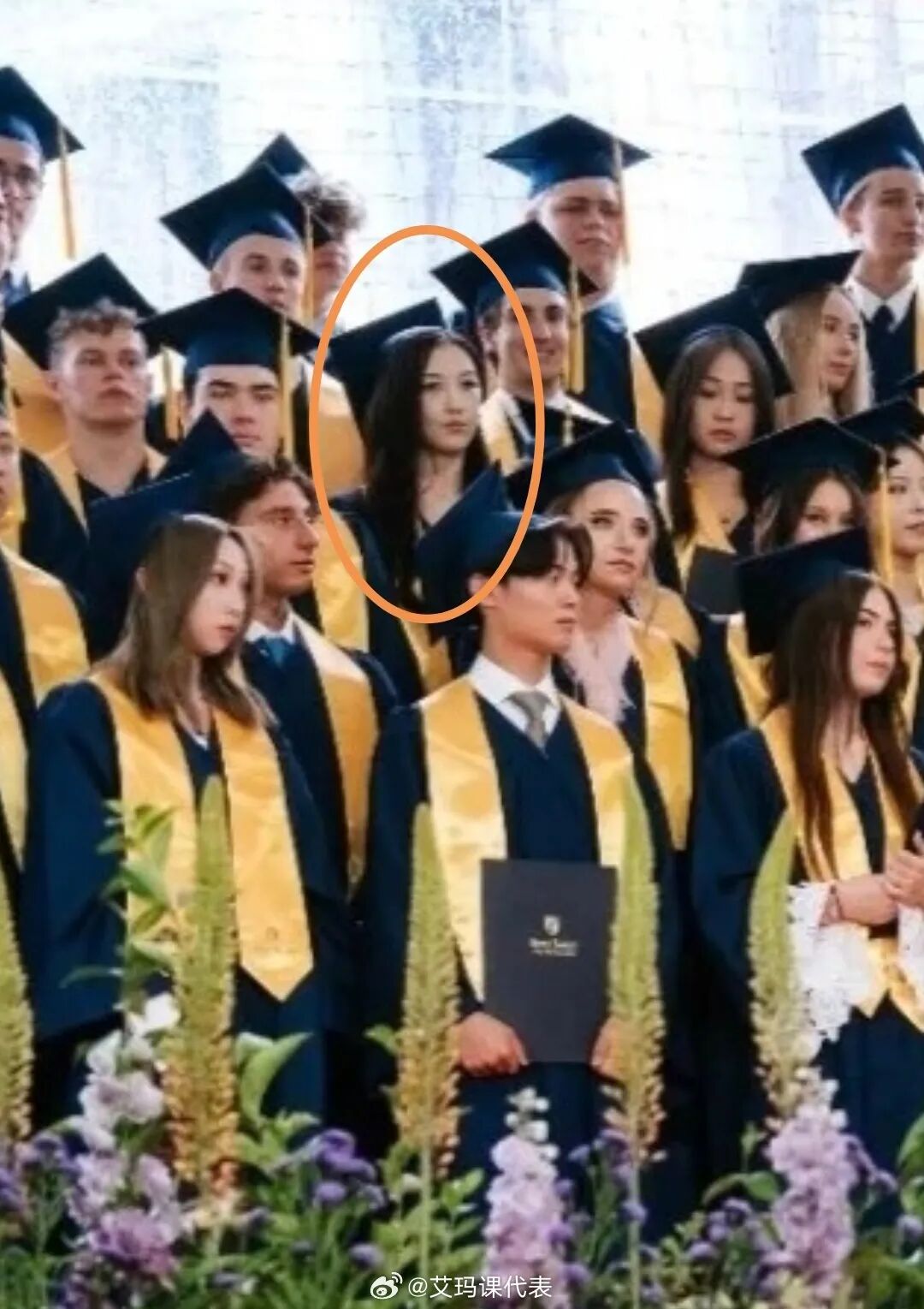 19岁李嫣正式从伦敦某高中毕业,穿毕业服与同学拍大合照,长发披肩神似王菲