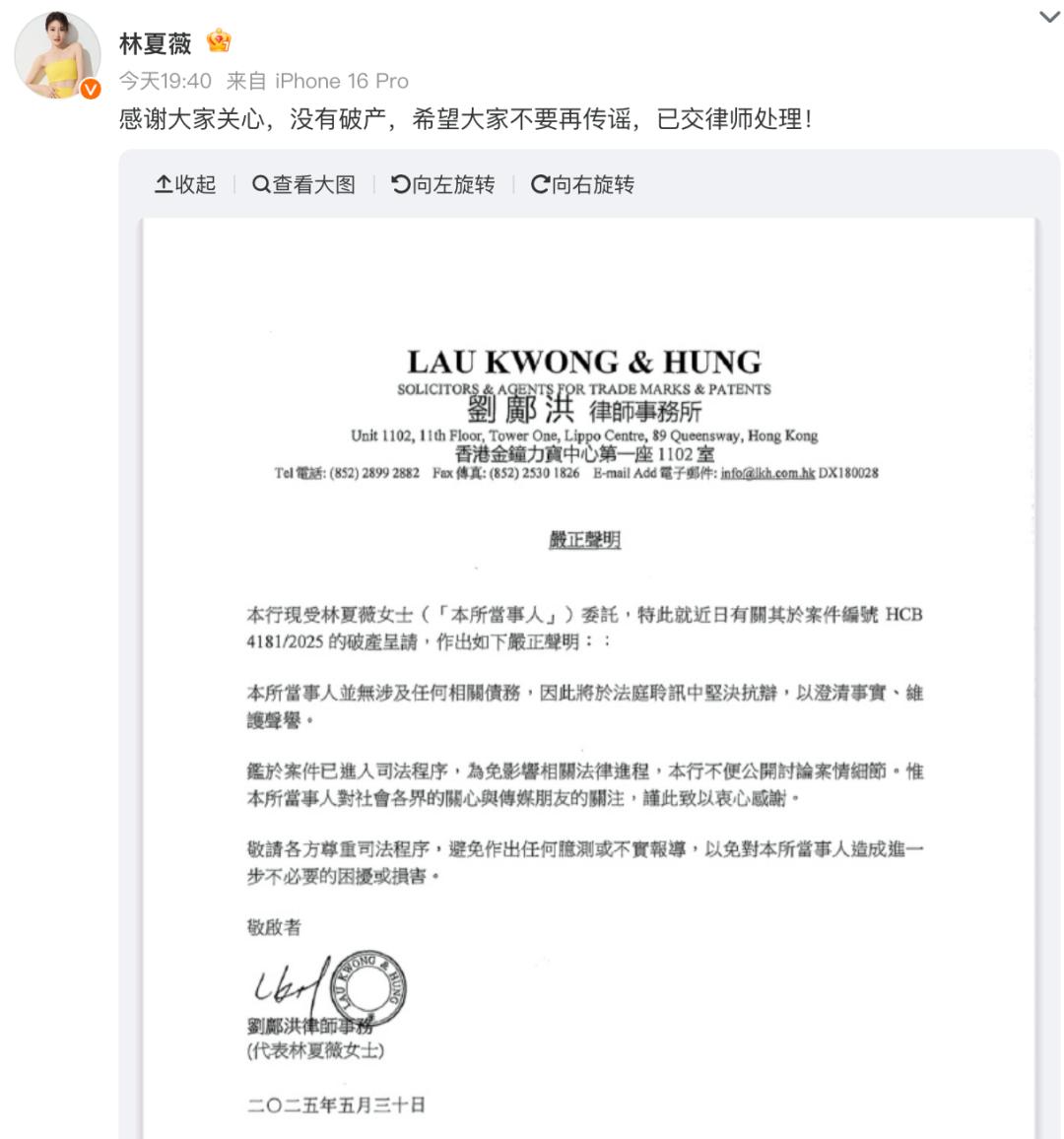 今日,林夏薇在微博发出律师声明:感谢大家关心,没有破产,希望大家不要再传谣,已交律师处理。