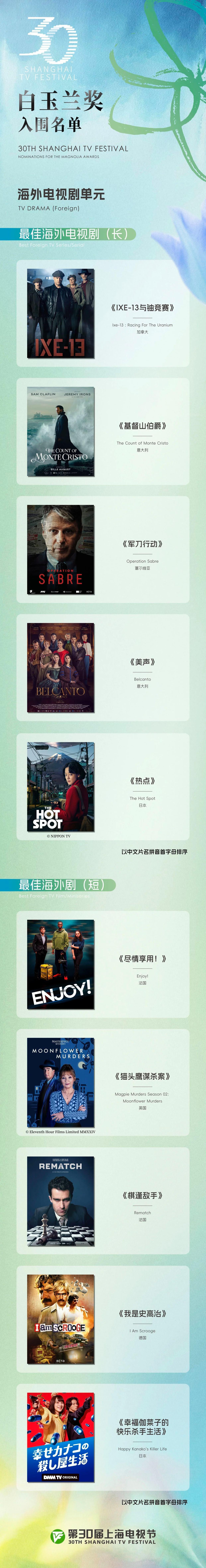 第30届上海电视节白玉兰奖入围名单(海外电视剧单元)公布,奖项将于6月27日“白玉兰绽放”颁奖典礼揭晓。