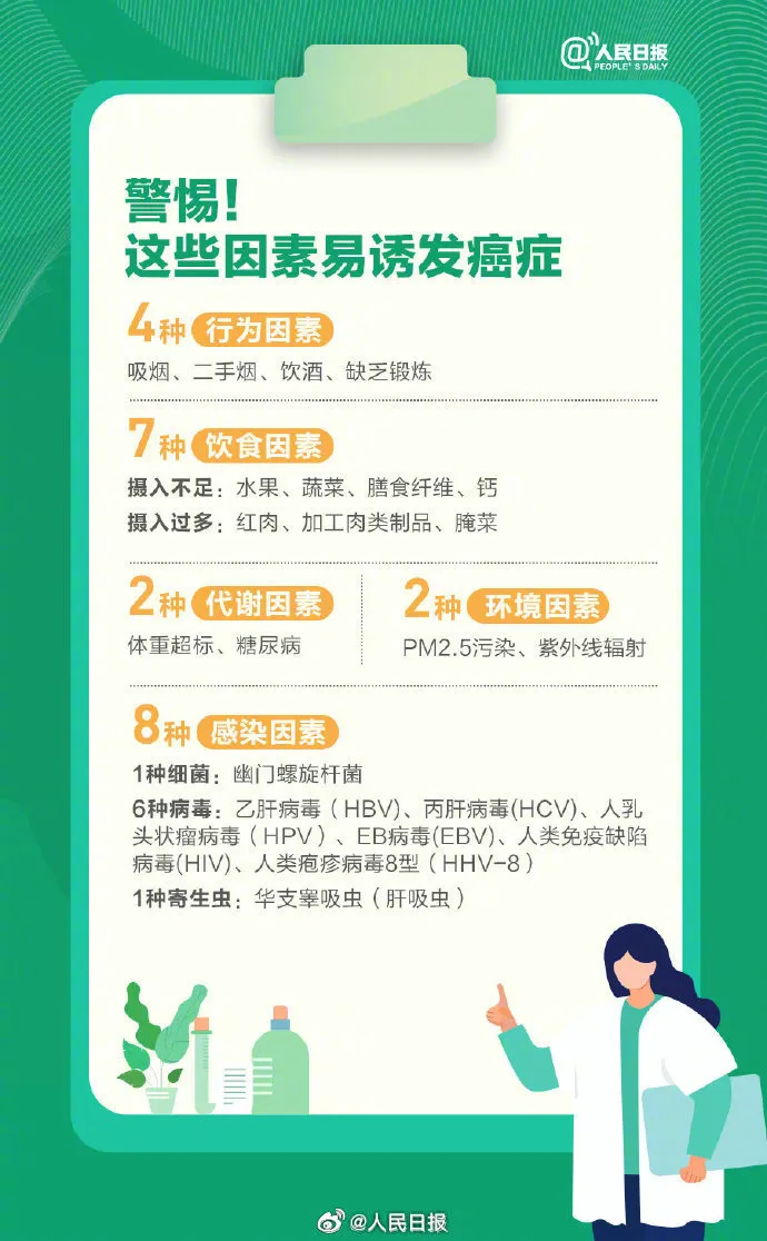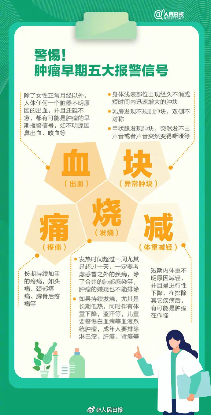 世界卫生组织认为,癌症是一种生活方式疾病,三分之一的癌症完全可以预防。最常见的23种致癌因素有什么?肿瘤早期5个报警信号有哪些?