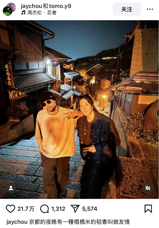 昨日,周杰伦在个人社交媒体账号发布照片与山下智久合影,并配文“京都的夜晚有一种榻榻米的稻香叫做友情”。照片中两人站在夜幕街道的台阶上,默契比耶,状态轻松。