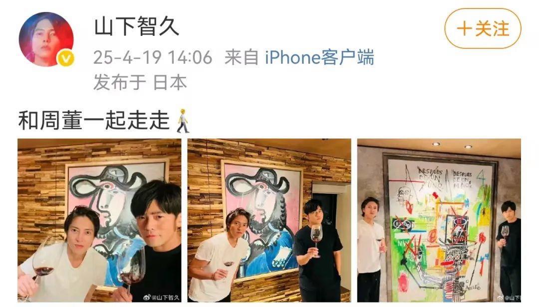 4月19日,日本男星山下智久在社交平台,晒出与周杰伦的合影,并配文:和周董一起走走。