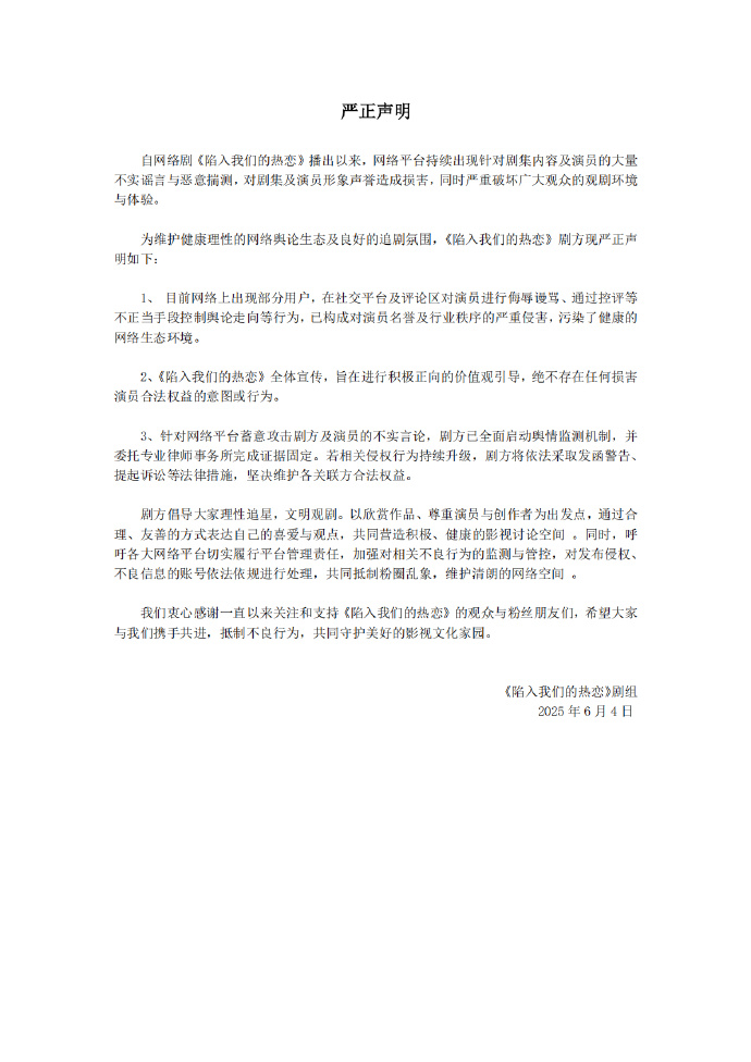 昨晚,刘浩存、王安宇《陷入我们的热恋》剧方发布声明,称部分用户对演员进行辱骂,通过控评等方式控制舆论走向,构成对演员名誉的严重侵害。剧方已全面启动舆情监测机制,若侵权行为升级将采取法律手段。剧方呼吁理性追星,文明观剧。