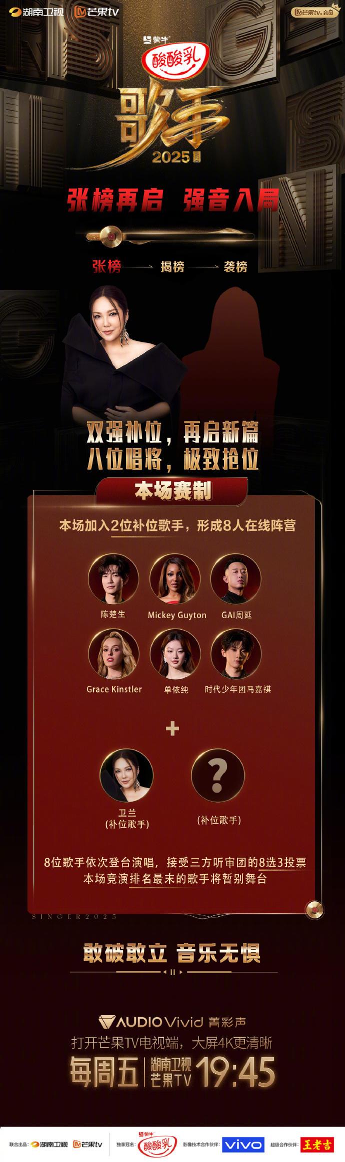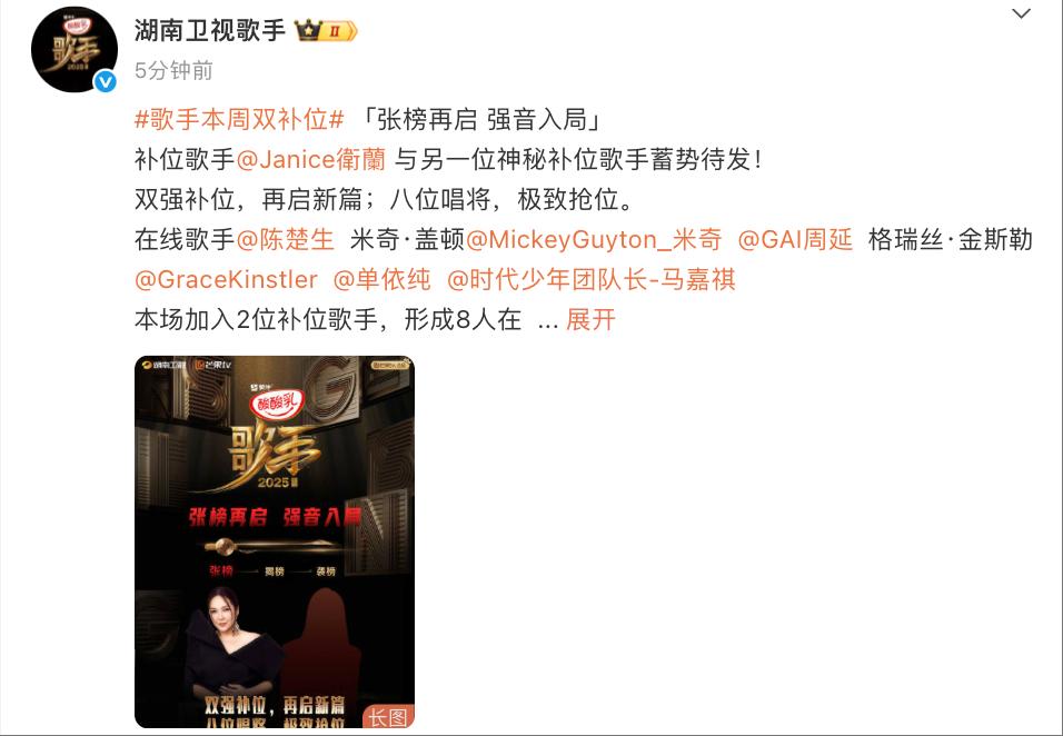 6月5日,@湖南卫视歌手 官宣:补位歌手卫兰与另一位神秘补位歌手蓄势待发!本场加入2位补位歌手,形成8人在线阵营。静待歌手们的舞台吧~