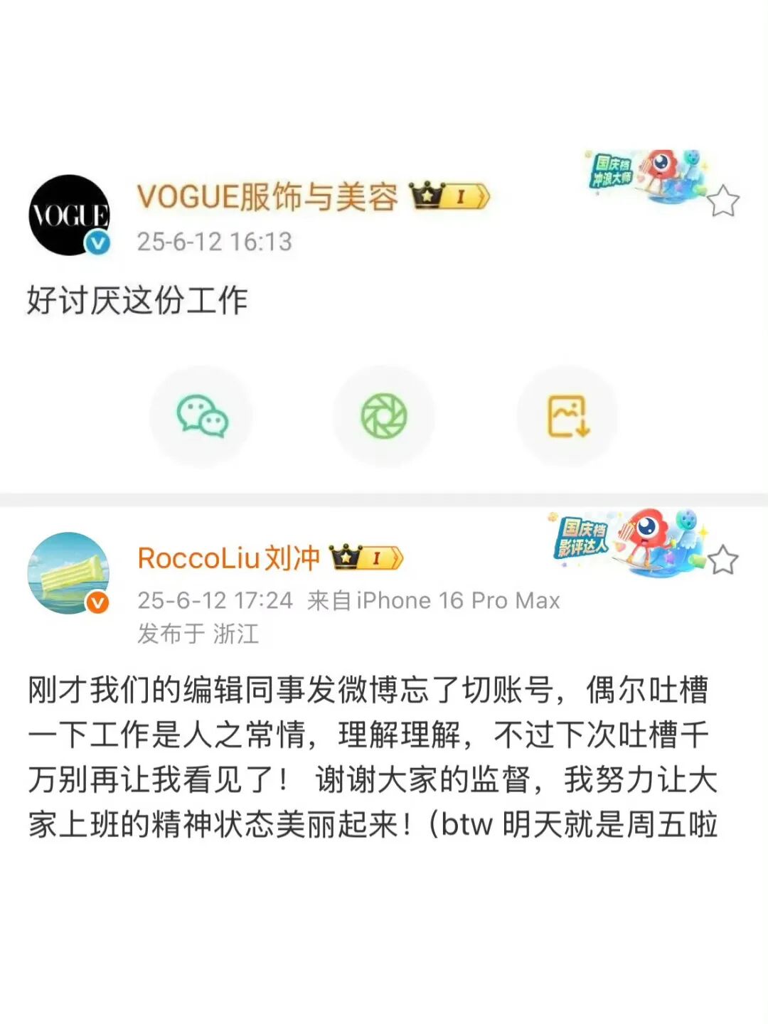 2025年6月12日,《服饰与美容Vogue》官方微博账号因疑似工作人员误操作,发布了一条内容为“好讨厌这份工作”的微博,随后迅速删除,但仍被网友截图传播,引发广泛讨论。