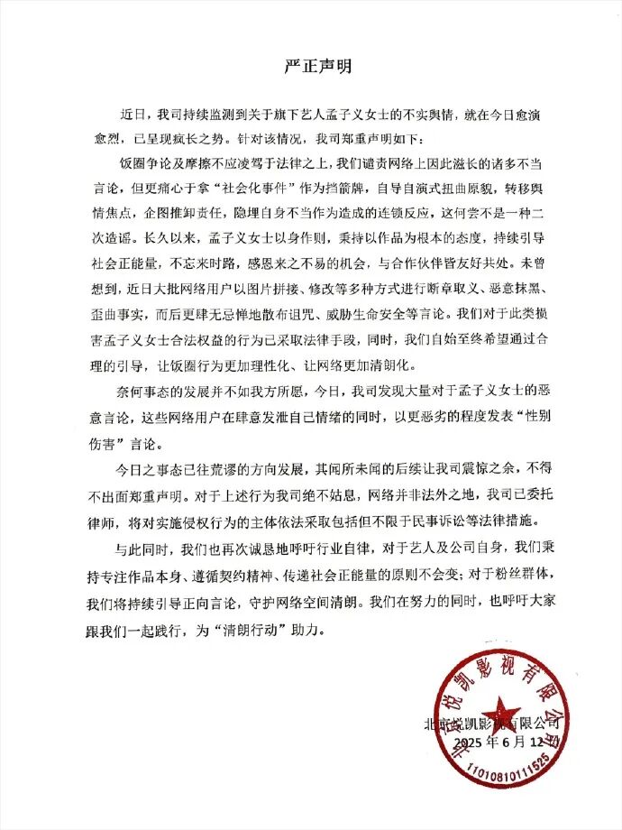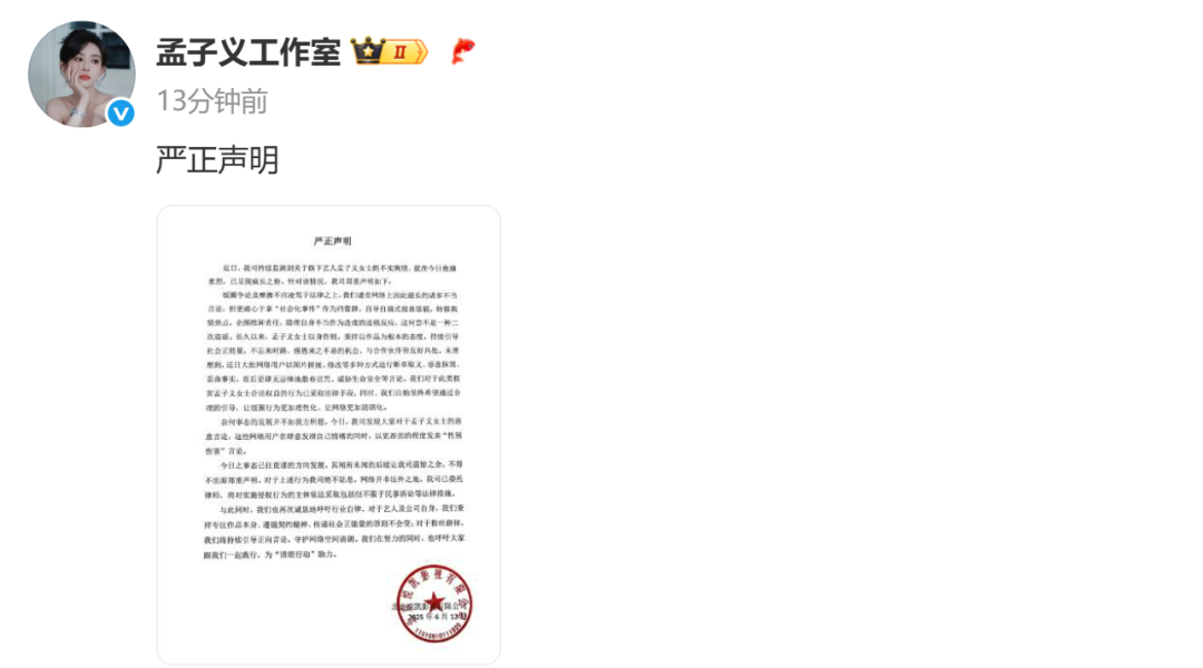 近日,我司持续监测到关于旗下艺人孟子义女士的不实舆情,就在今日愈演愈烈,已呈现疯长之势。针对该情况,我司郑重声明如下: