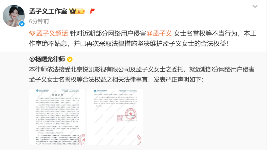 随后孟子义工作室转发@杨曙光律师微博,称针对近期部分网络用户侵害孟子义女士名誉权等不当行为,工作室绝不姑息,并已再次采取法律措施坚决维护孟子义女士的合法权益。