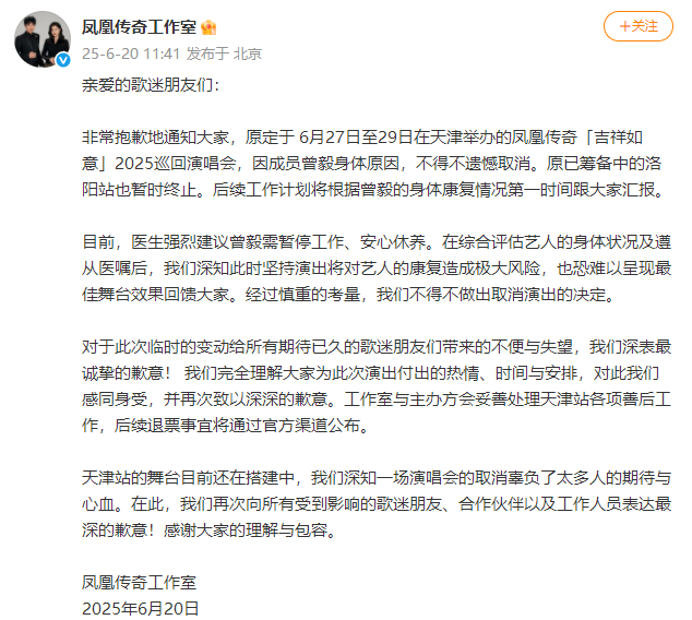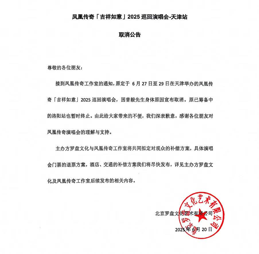 非常抱歉地通知大家,原定于 6月27日至29日在天津举办的凤凰传奇「吉祥如意」2025巡回演唱会,因成员曾毅身体原因,不得不遗憾取消。原已筹备中的洛阳站也暂时终止。