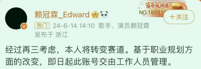 此前,赖冠霖曾发文宣布退出幕前,称“未在演戏和唱跳中找到自我认同”,社交账号移交团队管理,头像变为全黑。