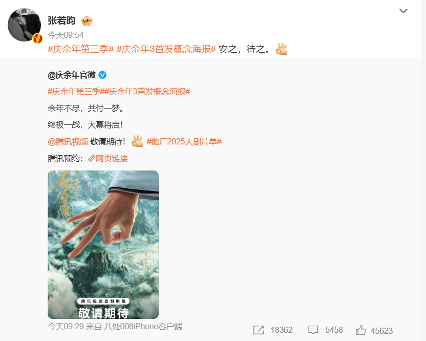 演员张若昀通过个人微博回应电视剧《庆余年》第三季官宣,相关话题迅速登上微博热搜榜首。