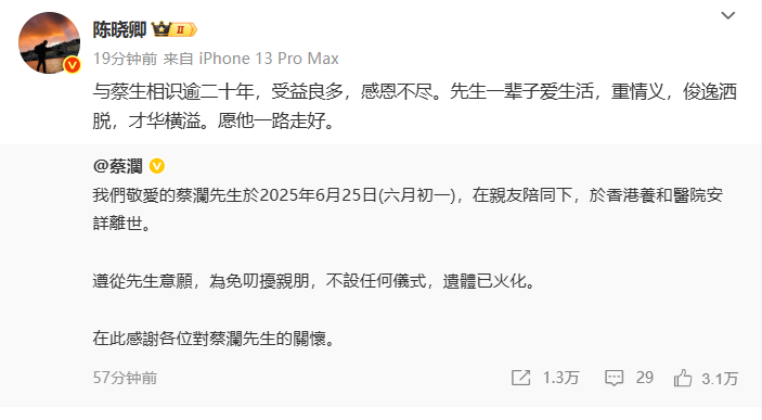 6月27日,@蔡澜 账号公布了蔡澜去世的消息:“我们敬爱的蔡澜先生于2025年6月25日(六月初一),在亲友陪同下,于香港养和医院安详离世。遵从先生意愿,为免叨扰亲朋,不设任何仪式,遗体已火化。”