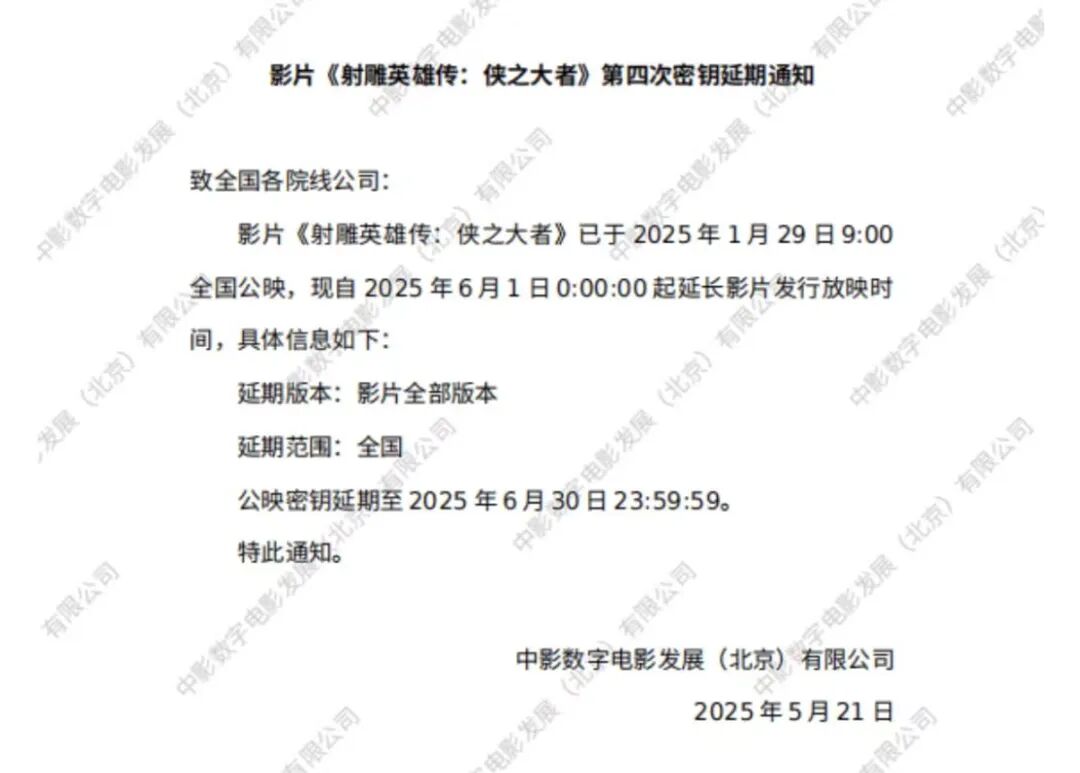 极目新闻记者注意到,除了《哪吒2》《射雕英雄传:侠之大者》这两部热门影片,动画电影《熊出没·重启未来》的密钥有效期也截至6月30日23:59。截至记者发稿时,这三部影片的出品方都没有宣布再次延长放映。