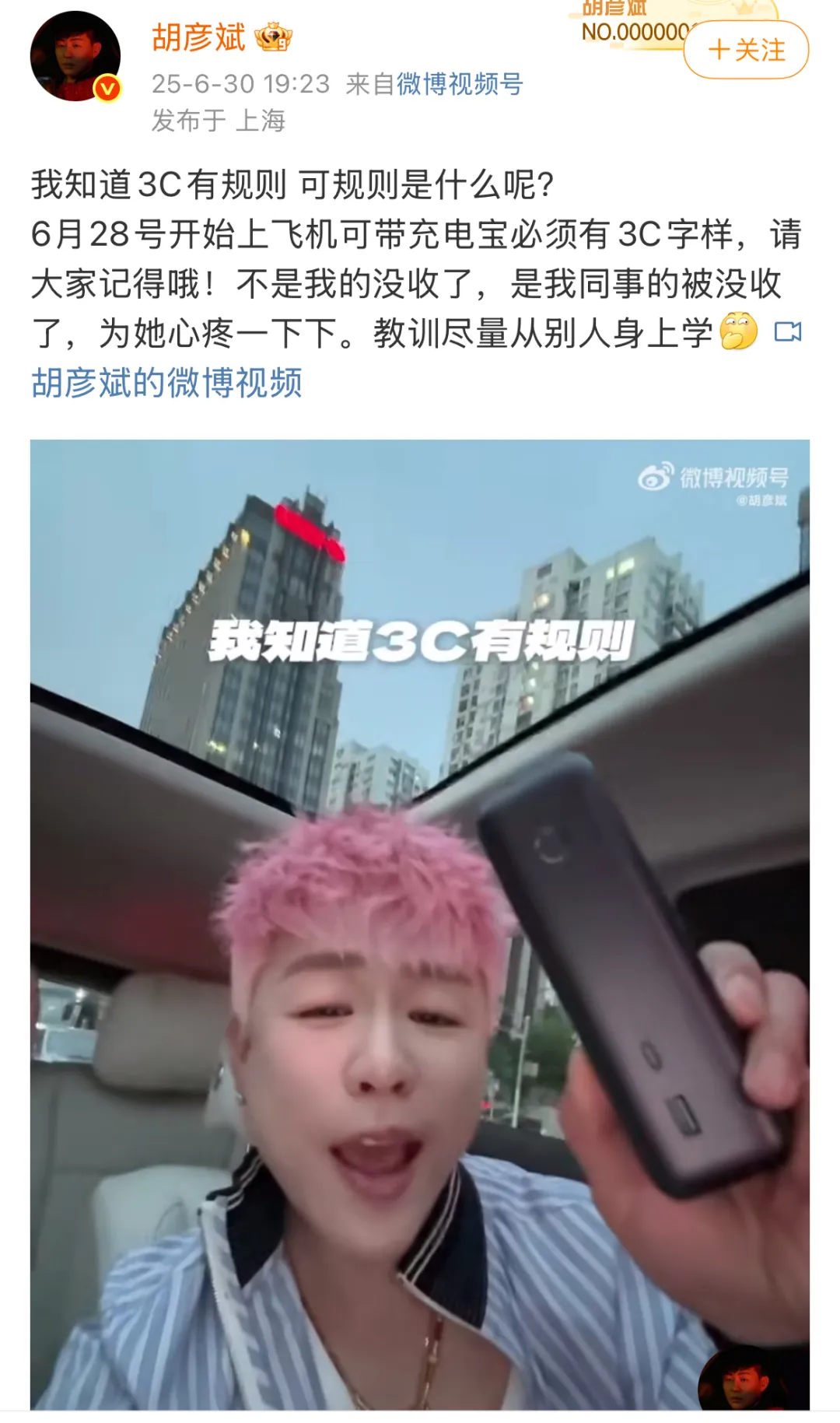 今天,胡彦斌发文回应:我知道3C有规则 可规则是什么呢?6月28号开始上飞机可带充电宝必须有3C字样,请大家记得哦!不是我的没收了,是我同事的被没收了,为她心疼一下下。教训尽量从别人身上学。