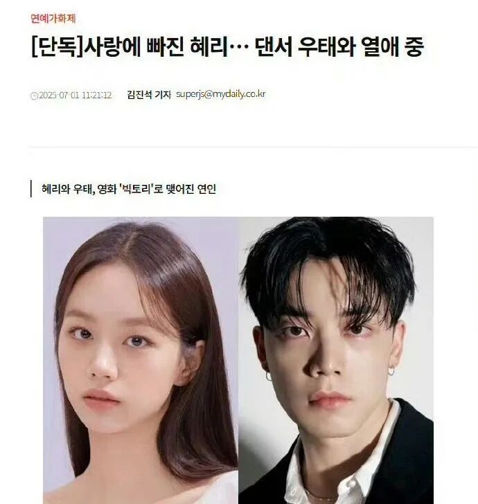 演艺界相关人士1日透露,惠利与宇泰已交往超过一年。两人的缘分始于去年上映的电影《Victory》。惠利在片中饰演充满激情的啦啦队新人队长,展现了包括DIVA《Why You Calling》、DEUX《Look Back At Me》等经典曲目的编舞,而担任这些舞蹈指导的正是宇泰。知情人士表示:"电影在庆尚南道巨济岛拍摄期间,两人通过舞蹈排练相识。此后在首尔约会时也展现出甜蜜模样,虽然向周围公开恋情不久,但实际交往已近一年。" 另一位相关人士谨慎透露:"双方都非常珍惜这段感情,在最艰难的时期彼此扶持,感情尤为深厚。"据韩媒,李惠利经纪公司针对与舞者WOOTAE(车宇泰)的恋爱传闻回应:“因为是私生活,无法确认立场。”