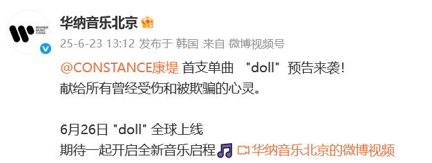 稍后,华纳音乐官博发文:“6月26日‘doll’全球上线,期待一起开启全新音乐启程。”