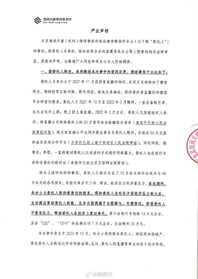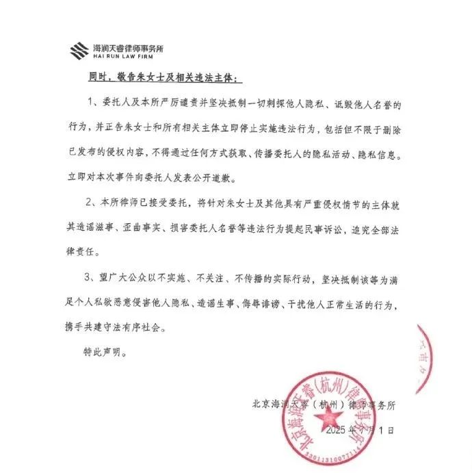 北京海润天睿(杭州)律师事务所依法接受都美竹女士(以下称 “委托人”)的委托,就委托人名誉权、隐私权等合法权益遭受朱女士等人侵害的相关法律事宜,发表本声明,也敬请广大网友和朱女士本人仔细阅读: