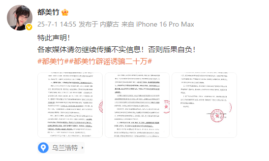 7月1日,都美竹发布严正声明,辟谣“诱骗二十万”,并称“各家媒体请勿继续传播不实信息!否则后果自负!”