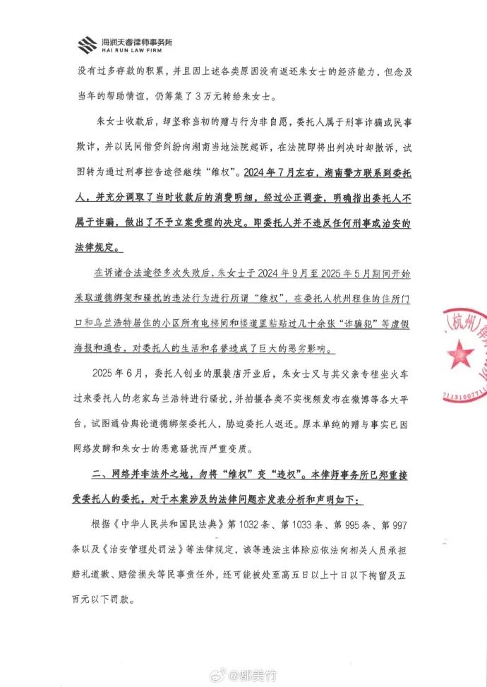 2025年6月,委托人创业的服装店开业后,朱女士又与其父亲专程坐火车过来委托人的老家乌兰浩特进行骚扰,并拍摄各类不实视频发布在微博等各大平台,试图通告舆论道德绑架委托人,胁迫委托人返还。原本单纯的赠与事实已因网络发酵和朱女士的恶意骚扰而严重变质。