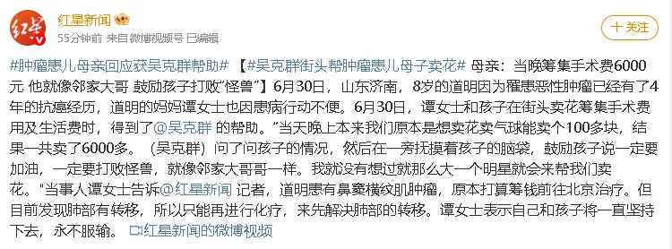 6月30日晚上,不少网友在社交平台发布视频称,在山东济南街头偶遇歌手吴克群帮一位患癌男孩卖花,引发热议。
