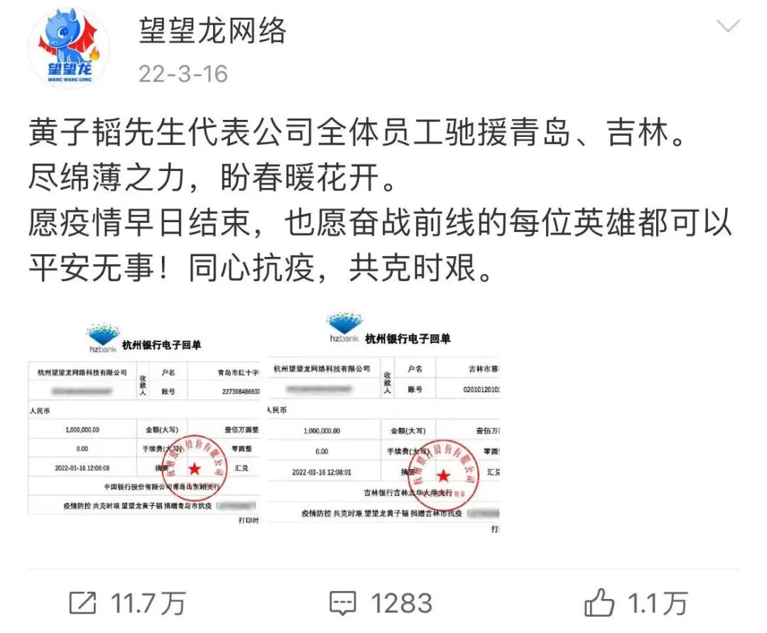2022年3月黄子韬以杭州望望龙网络科技有限公司名义,通过吉林市政府合作交流办公室向吉林市慈善总会捐赠 100 万人民币。