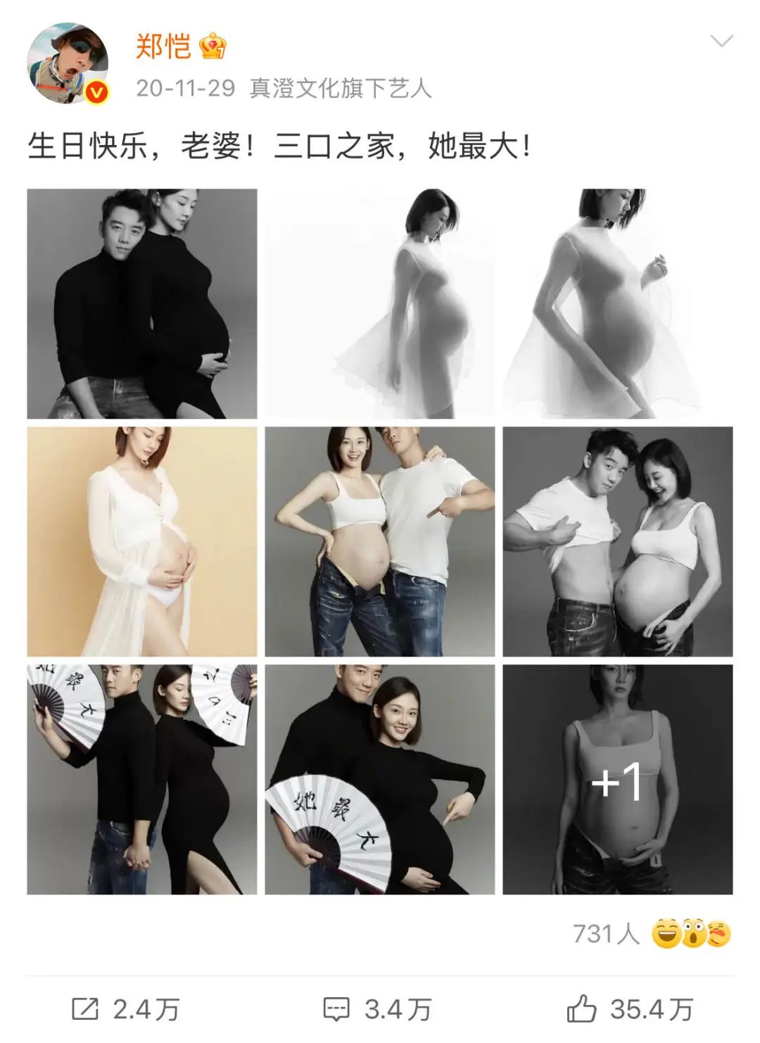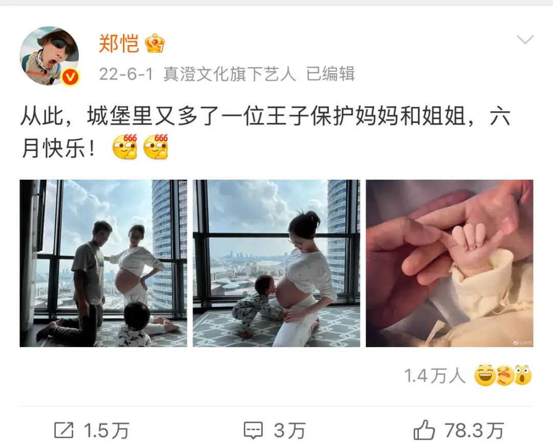 2022年6月1日:二胎儿子降生,郑恺晒全家福告白:城堡里又多一位王子保护妈妈姐姐”。
