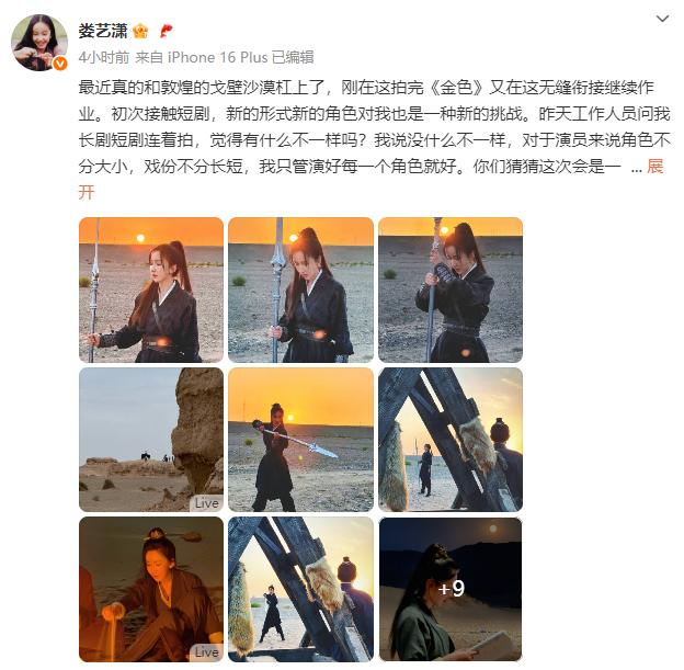 她称:“最近真的和敦煌的戈壁沙漠杠上了,刚在这拍完《金色》又在这无缝衔接继续作业。初次接触短剧,新的形式新的角色对我也是一种新的挑战。昨天工作人员问我长剧短剧连着拍,觉得有什么不一样吗?我说没什么不一样,对于演员来说角色不分大小,戏份不分长短,我只管演好每一个角色就好。你们猜猜这次会是一个什么样的角色?P.S U1S1不管长剧短剧,在戈壁和荒漠拍戏,都挺累的,对自己说,加油。”