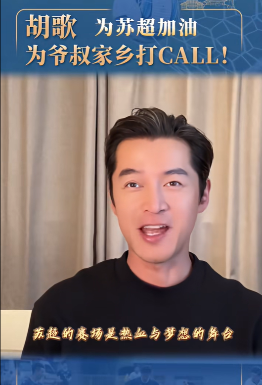 胡歌在视频里为泰州队加油打气“绿茵逐梦,无畏向前,苏超的赛场是热血与梦想的舞台,踢出精彩,赛出荣耀,为你们加油!祝愿泰州文旅欣欣向荣,期待早点来泰州,泰州来早点!”