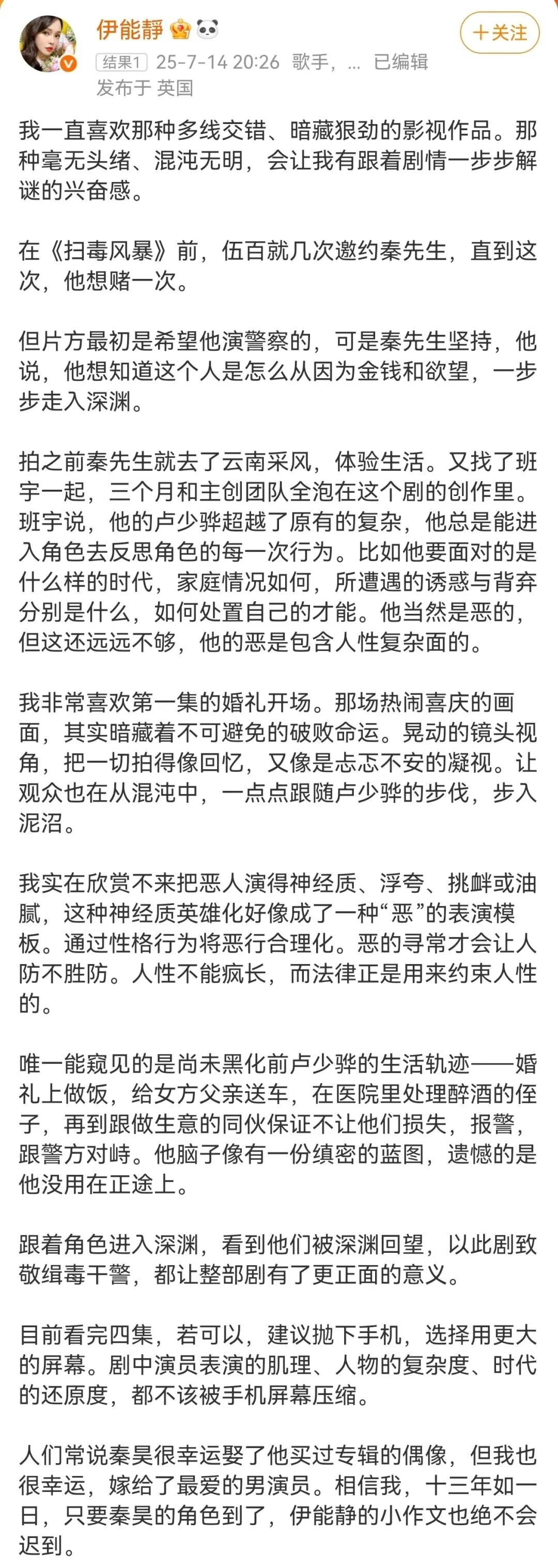 近日,秦昊主演的《扫毒风暴》正在热播。7月14日晚,伊能静在个人社交平台为《扫毒风暴》撰写剧评式“小作文”。在结尾处,她向秦昊深情表白:人们常说秦昊很幸运娶了他买过专辑的偶像,但我也很幸运,嫁给了最爱的男演员。相信我,十三年如一日,只要秦昊的角色到了,伊能静的小作文也绝不会迟到。