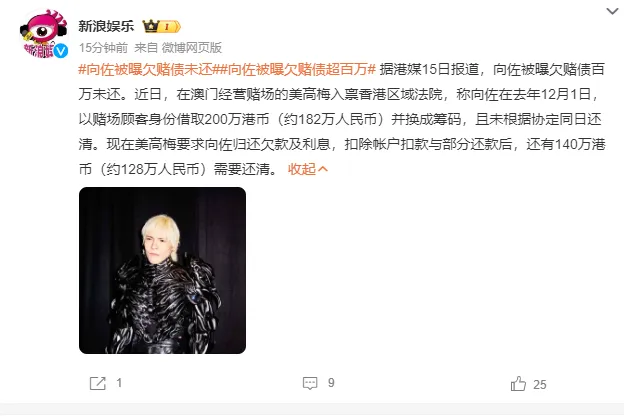 据台媒报道,知名艺人郭碧婷老公、同时也是香港电影大亨向华强之子向佐惊爆欠下赌债不还,遭到澳门美高梅赌场提告追讨,金额高达140万港币(折合人民币约128万元),目前此案已由香港区域法院受理中。