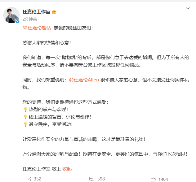 感谢大家的热情和心意!我们知道,每一次“抛物线”的背后,都是你们急于表达爱的瞬间。但为了所有人的安全与活动秩序,请不要向舞台或工作区域投掷任何物品。同时,我们郑重说明:任嘉伦很珍惜大家的心意,但不会接受任何实体礼物。