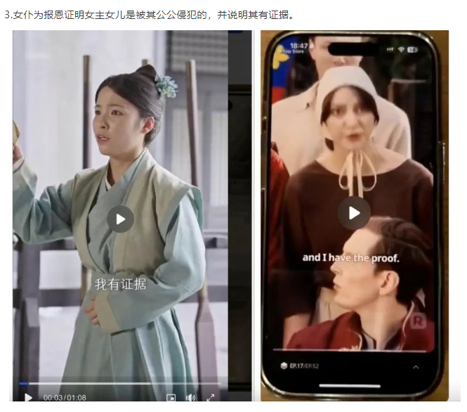 极目新闻记者注意到,听花岛方面提供对比大量截图,表示ReelShort平台上线播放的微短剧《The Seamstress ls The Duchess》,其人物设置、人物关系、经典剧情及情节起承转合等,均与《卖菜大妈竟是皇嫂》高度相似;ReelShort上线微短剧《Mated to My Brother-in-Law Alpha》,也涉嫌抄袭《冷面小叔宠嫂无度》,英文短剧的台词,也几乎是英文复刻了后者的台词。