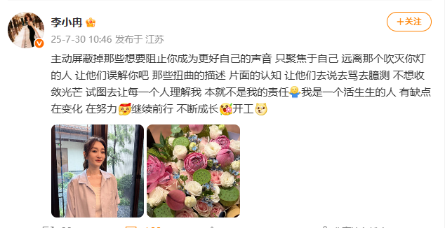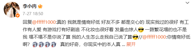 7月27日,李小冉曾发文回复网友称我就是情商好低,好友不多,都是交心的。一路繁花塌的也不是我,塌不塌不是你说了算,我的人生怎么走我自己说了算。