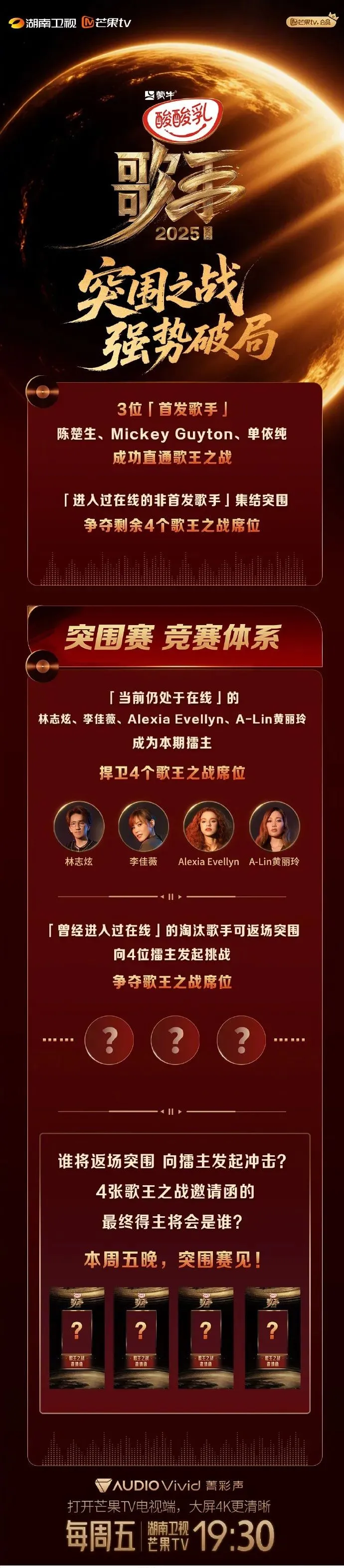 突围之战,强势破局!「当前仍处于在线」的@林志炫@李佳薇Jess 艾莉西亚·伊芙琳@AlexiaEvellyn TerryLin @天生歌姬A-Lin 黄丽玲 成为本期擂主,捍卫4个歌王之战席位!「曾经进入过在线」的淘汰歌手可返场突围,向4位擂主发起挑战,争夺歌王之战席位!3位「首发歌手」陈楚生、Mickey、单依纯成功直通歌王之战!「进入过在线的非首发歌手」集结突围,争夺剩余4个歌王之战席位!谁将返场突围向擂主发起冲击?4张歌王之战邀请函的最终得主将会是谁?