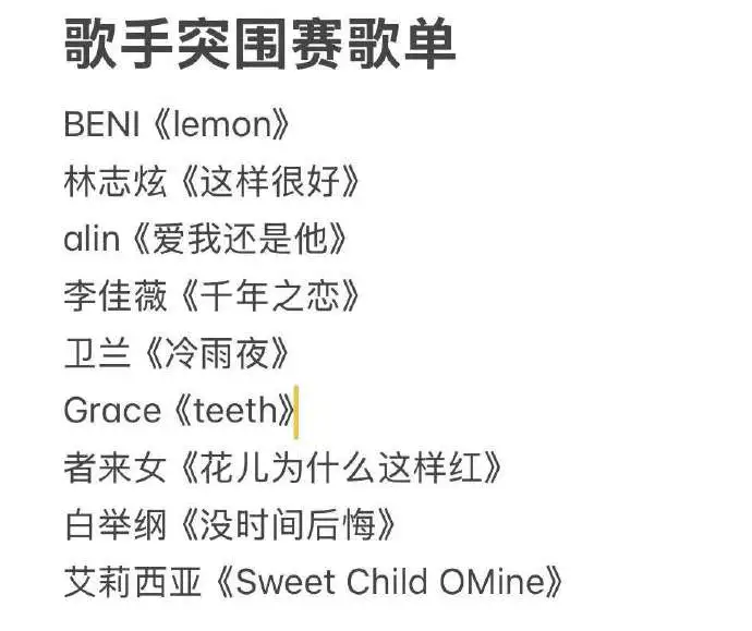 此前,湖南卫视歌手转发微博,范玮琪、GAI周延、火星电台宣布因档期或行程原因不能参加本周突围赛。此前淘汰的在线歌手还有者来女、卫兰、BENI、白举纲将参加,最新参赛名单里也没有马嘉祺的名字。
