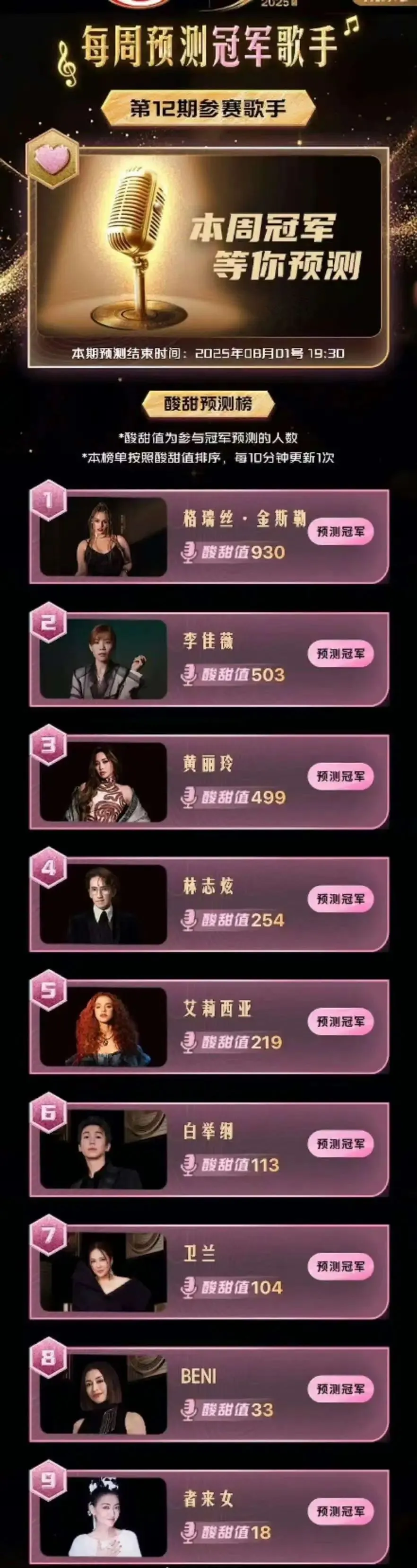 黄丽玲、李佳薇、林志炫、卫兰、白举纲、者来女、美国格格、巴西艾莉西亚、日本BENI,9进4,晋级总决赛。