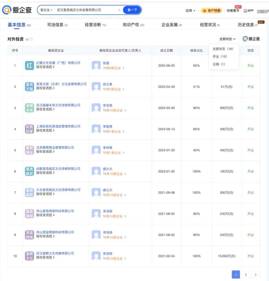 对外投资信息显示,武汉星竞威武文体发展有限公司直接对外投资16家企业,分布在北京、上海、武汉等地,版图涉及传媒、管理、酒店等领域,目前15家为开业状态。通过直接或间接的方式,该公司拥有多家企业的实控权。知识产权相关信息显示,该公司已成功注册多枚“ESTAR”“ESTAR PRO”商标,国际分类涉及广告销售、日化用品、酒、教育娱乐等。