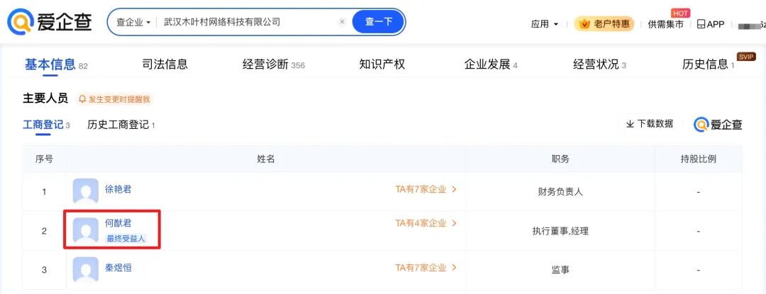 爱企查App显示,星竞威武中国内地关联公司武汉星竞威武文体发展有限公司成立于2016年6月,法定代表人为孙力伟,注册资本5亿元人民币,经营范围包括体育赛事策划、组织体育表演活动、组织文化艺术交流活动等,由武汉木叶村网络科技有限公司全资持股。值得一提的是,主要人员信息显示,何猷君为武汉木叶村网络科技有限公司最终受益人。